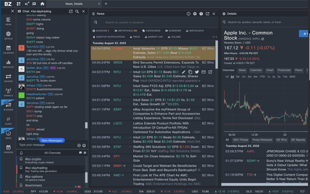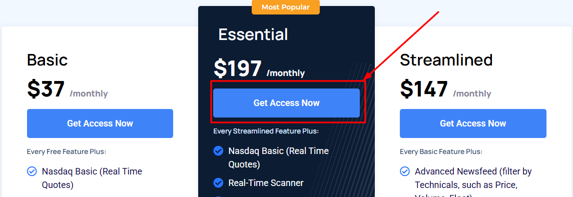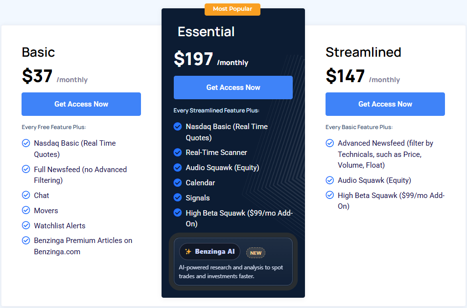| Features | Nasdaq Basic, Full Newsfeed, Chat, Movers, Watchlist Alerts, Benzinga Premium Articles | Nasdaq Basic, Real-Time Scanner, Audio Squawk (Equity), Calendar, Signals, High Beta Squawk | Advanced Newsfeed, Audio Squawk (Equity), High Beta Squawk |