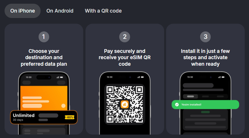 Buy a plan before you even leave home. As soon as you land, turn on the eSIM. You’re online. No waiting in line. No language barriers. No overpriced airport SIMs.
