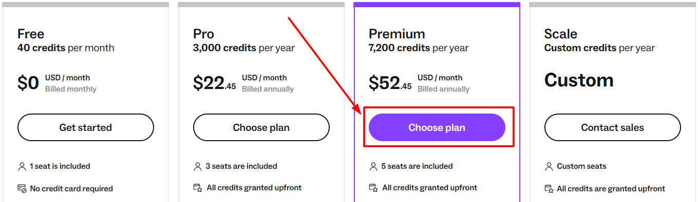 Step 3: Choose the pricing plan that best suits your needs (Free, Pro, Premium, or Scale).