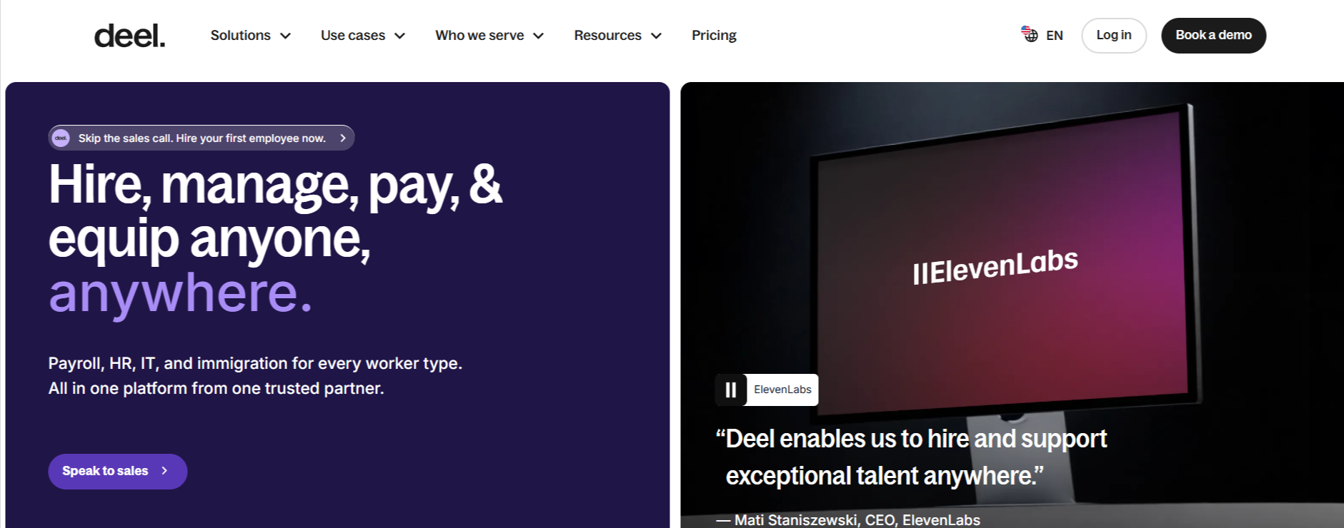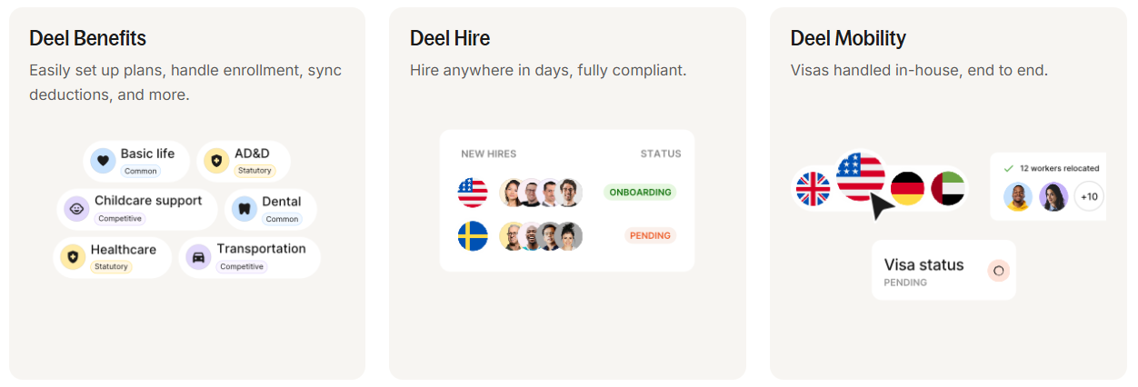 - Choose Deel for an all-in-one platform that is easy to use, fast to onboard, and offers a comprehensive suite of tools for the entire employee lifecycle, from recruitment and HR to IT management and innovative payment options.