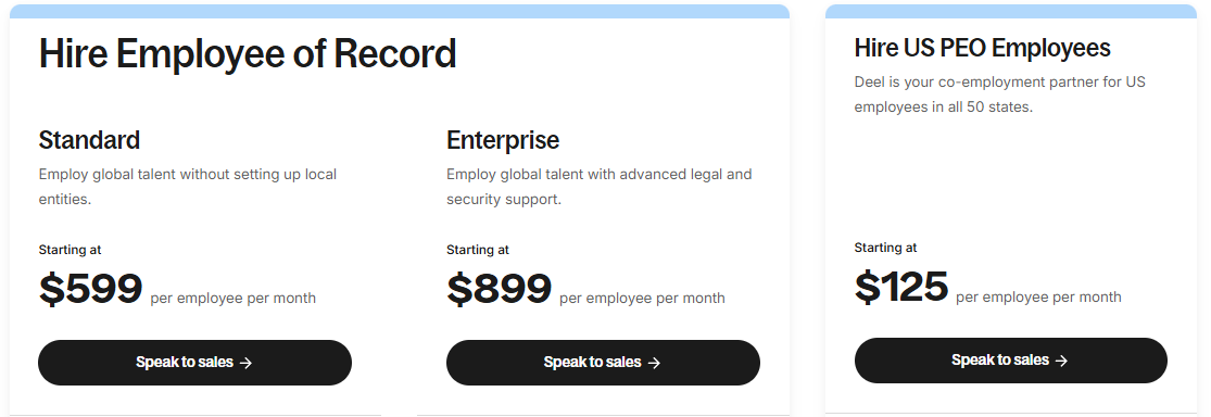 - EOR (Employer of Record): Starts at $599 per employee per month. This includes legal employment, compliant contracts, payroll, taxes, and benefits administration in over 100 countries. Discounts are often available for annual billing.